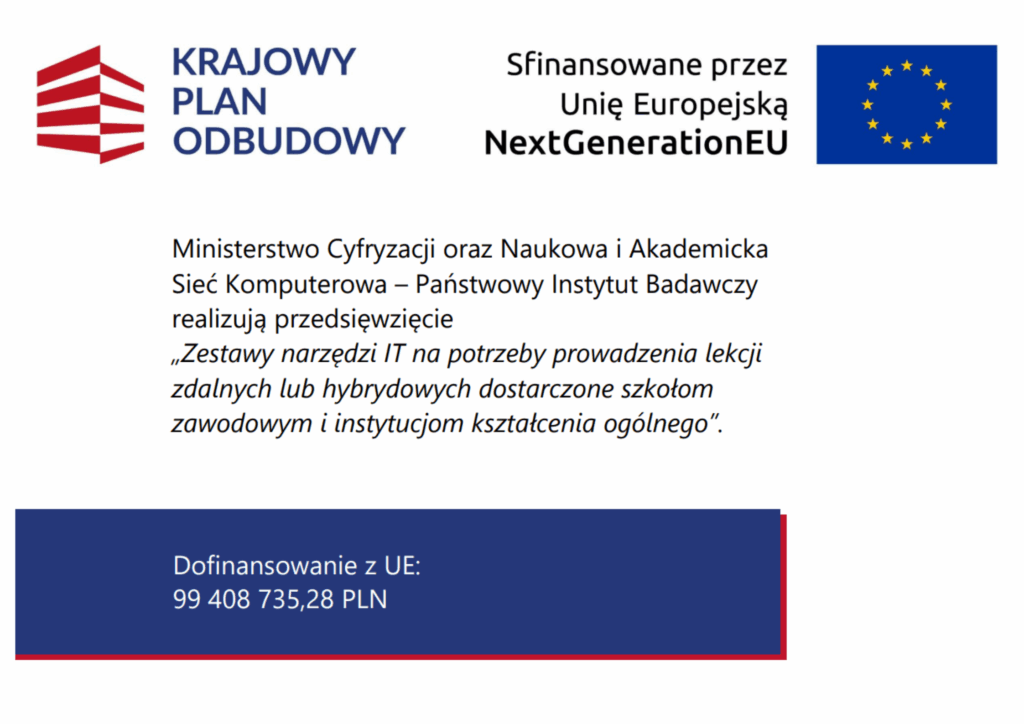- Nazwa inwestycji „Wdrażanie inwestycji C2.2.1 Wyposażenie szkół/instytucji w odpowiednie urządzenia i infrastrukturę ICT w celu poprawy ogólnej wydajności systemów edukacji, wskaźnik C12L Zestawy narzędzi informatycznych na potrzeby prowadzenia lekcji zdalnych lub hybrydowych dostarczone szkołom zawodowym i instytucjom kształcenia ogólnego”,